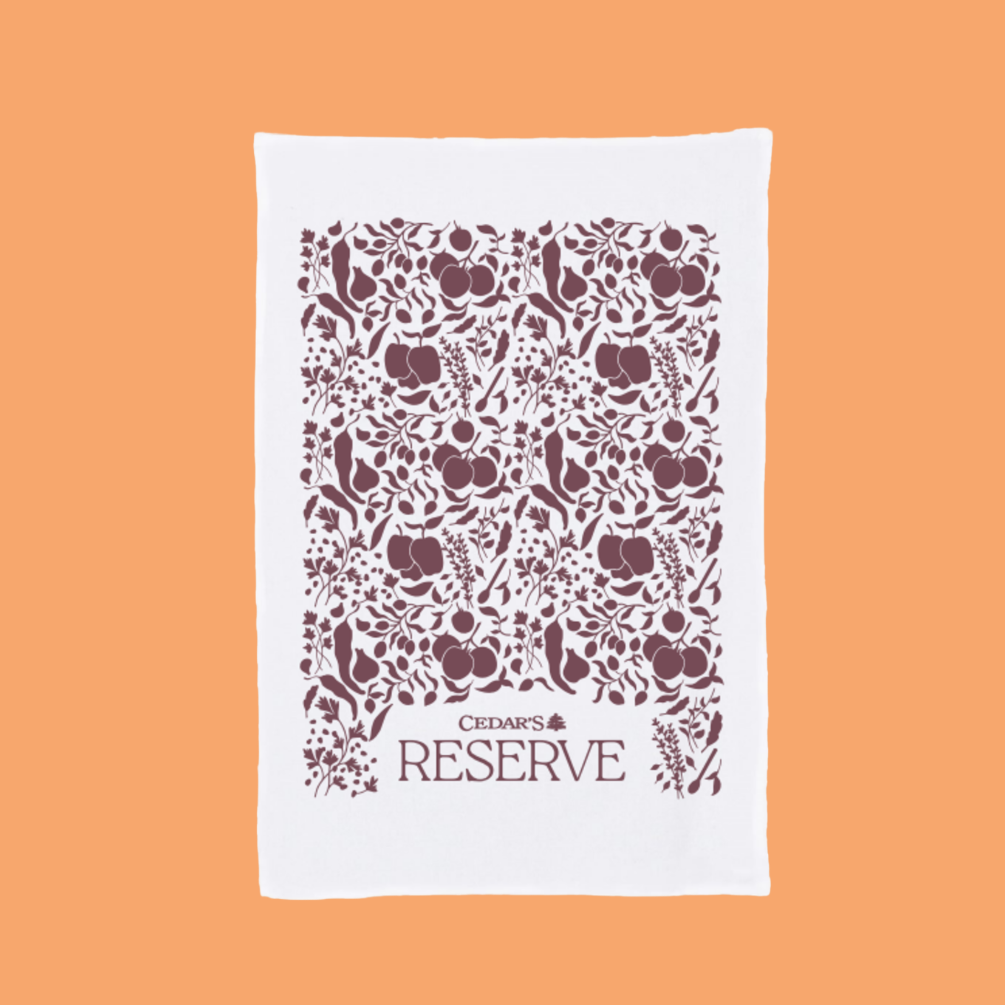 To round out the collection, we created a premium tea towel printed edge-to-edge with a custom illustrated pattern developed specifically for this launch. The artwork incorporates ingredients and textures from Cedar’s product line, translated into a modern, monochromatic print that feels more “boutique home goods store” than promotional item. Water-based ink kept the print soft to the touch and allowed the illustration to feel elevated, authentic, and worthy of a kitchen display.
